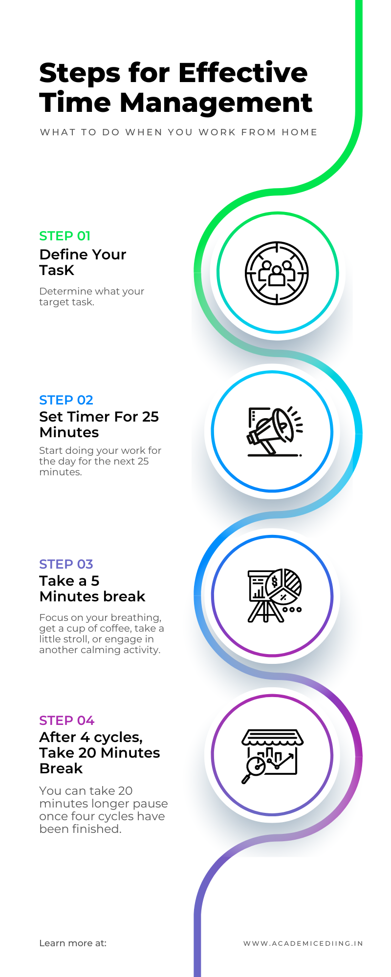 While working from home is tough. So, I use Pomodoro technique to work efficiently for better productivity. This time management technique was created by Francesco Cirillo in the late 1980s. It divides the task into intervals that are generally 25 minutes long and are separated by brief 5 minute breaks.